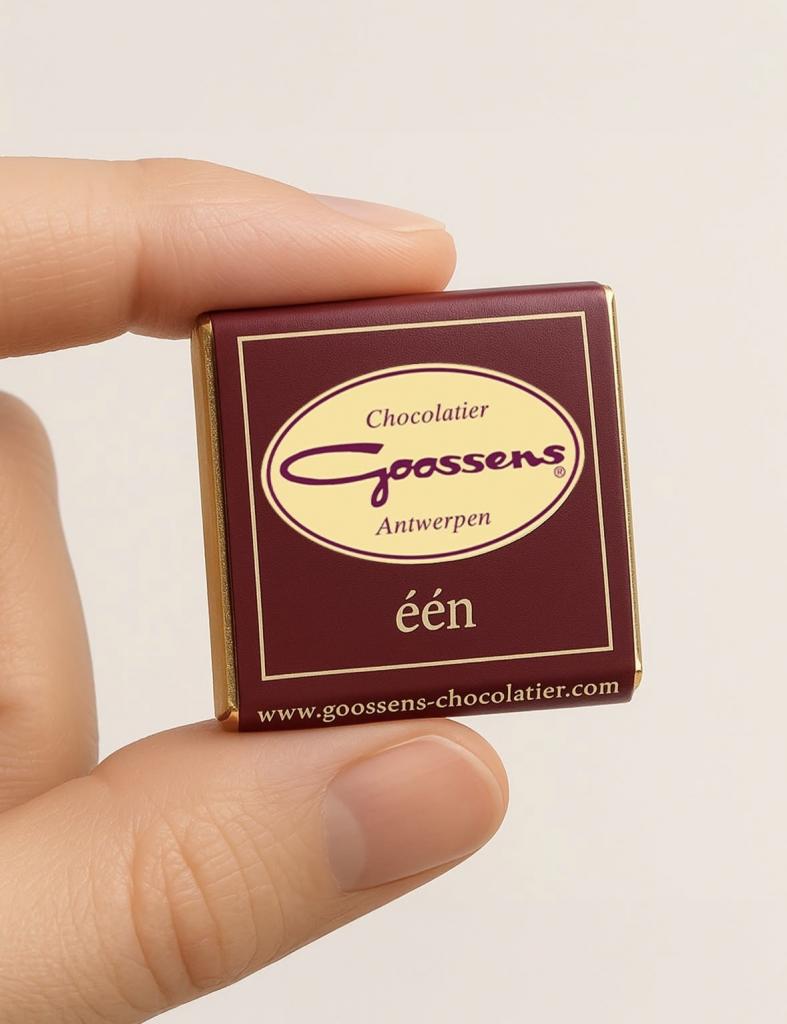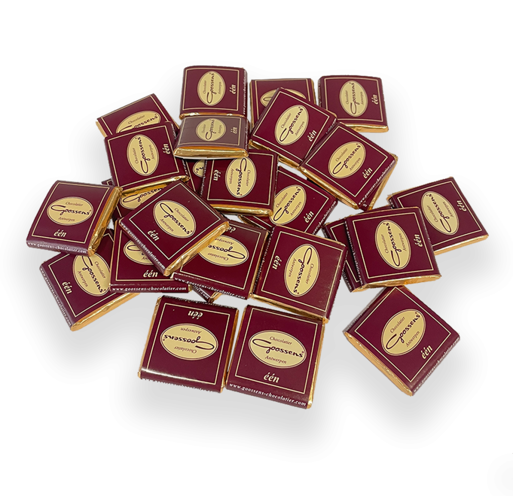 “Één” is een vierkant, individueel verpakt chocolaatje van 4 g, genaamd 'Napolitain'.